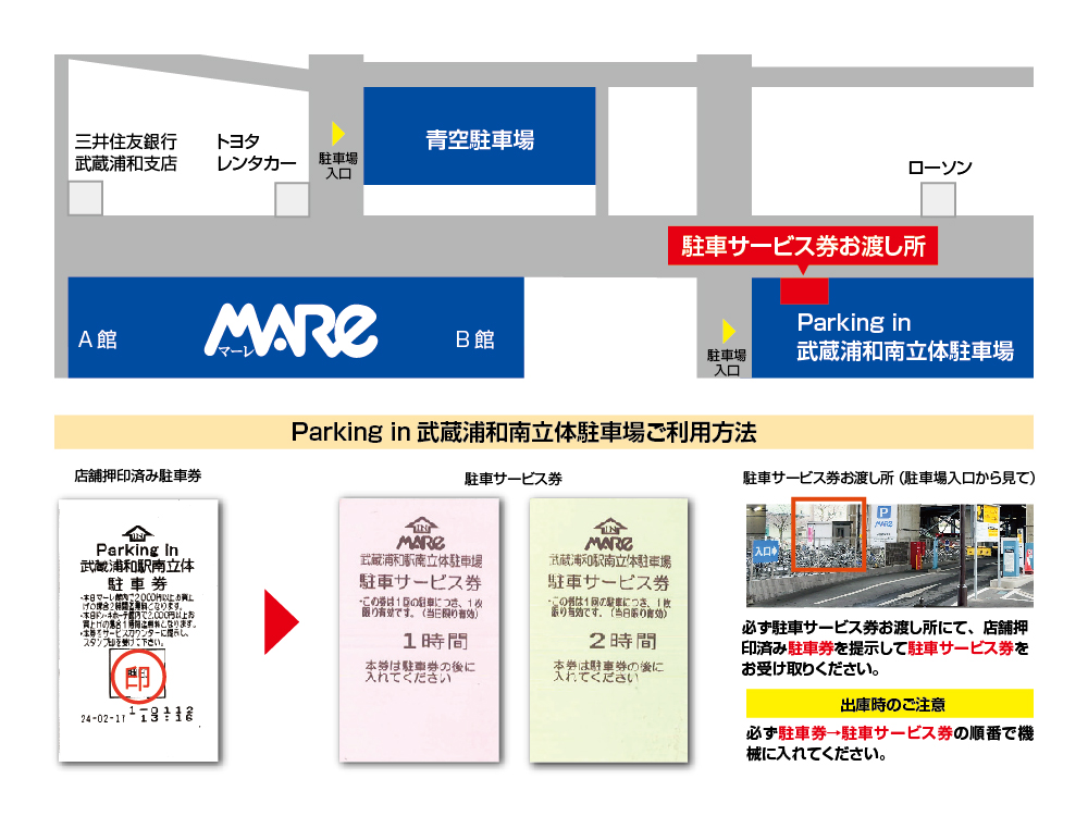 | 出庫方法 | 精算機に、お車ナンバーを入力後 店舗で受け取ったサービス券を 「読取部」にかざし、精算後、出庫してください。 | 駐車場入口にございます 駐車サービス券お渡し所で 押印済駐車券をご提示ください。 出庫用サービス券をお渡し致します。 |